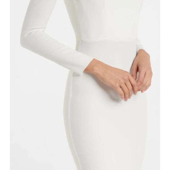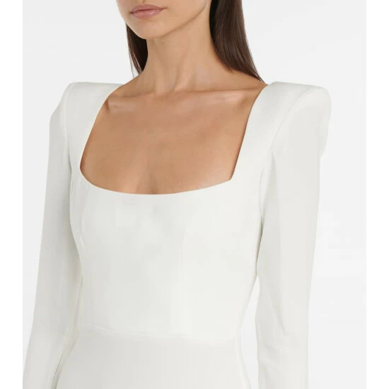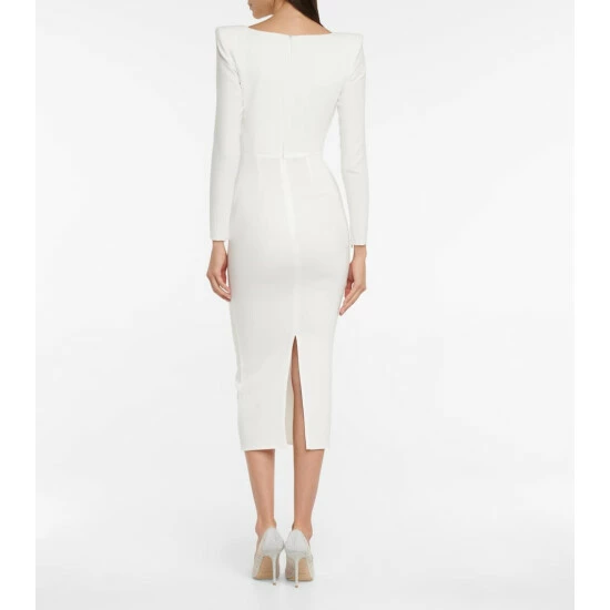 Build show-stopping party looks around the Carey midi dress from Alex Perry. It’s defined by a square neckline, zipped cuffs and padded shoulders for empowered elegance. The stretch-crêpe fabrication sculpts the body’s natural contours for a flattering silhouette.
