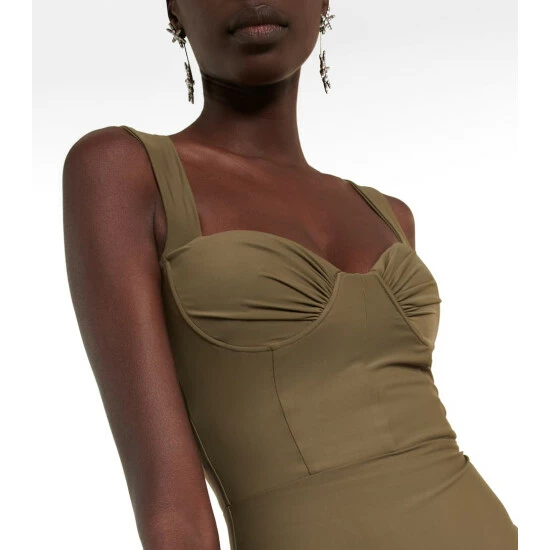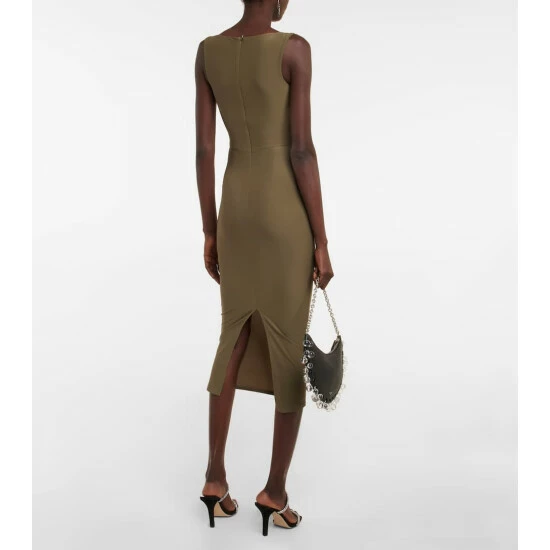 Update your cocktail edit with the Claron midi dress from Alex Perry. Made of stretchy crΓͺpe, the khaki style has a body-hugging fit and a sweetheart neckline.