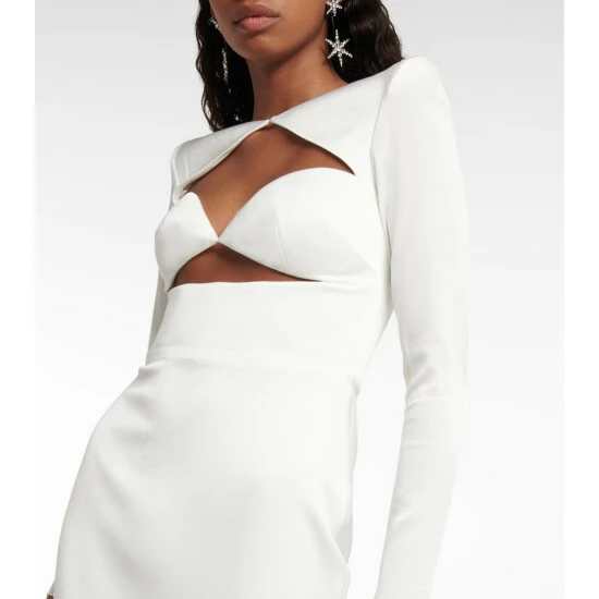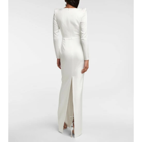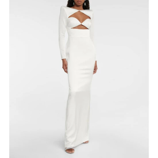 The Cohan gown from Alex Perry is an elegant full-length design made from satin-crรชpe with padded shoulders. The fitted style has long sleeves with zipped cuffs and a sweetheart neckline featuring a cutout detail.