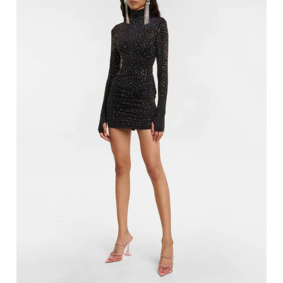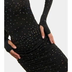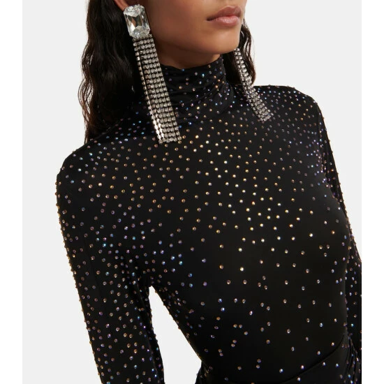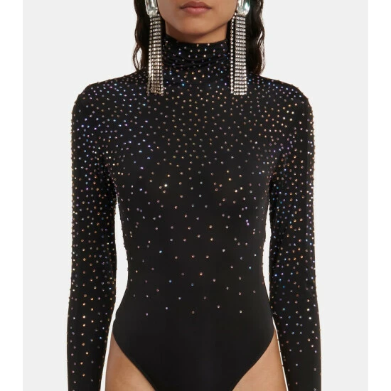 Turn heads at your next party courtesy of the Sloan crystal-embellished bodysuit from Alex Perry. It has a turtleneck silhouette with thumb holes the sleeves.