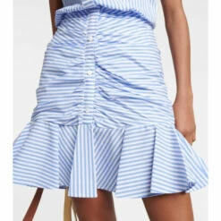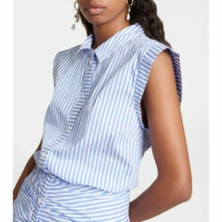 This sleeveless shirt dress from Veronica Beard features an all-over thin, breezy stripe pattern. The skirt adds ruching details to add texture to this contemporary design.