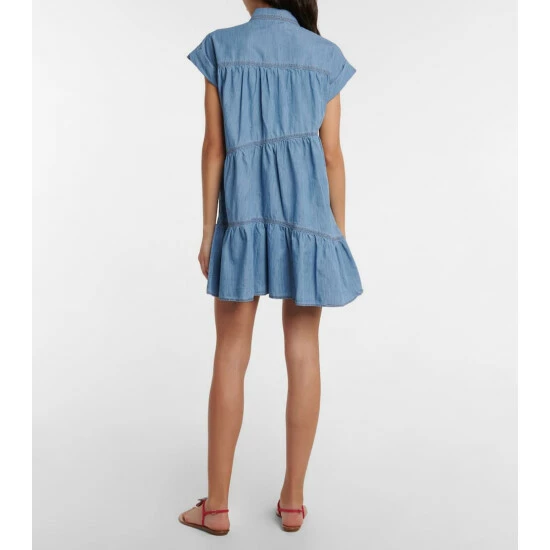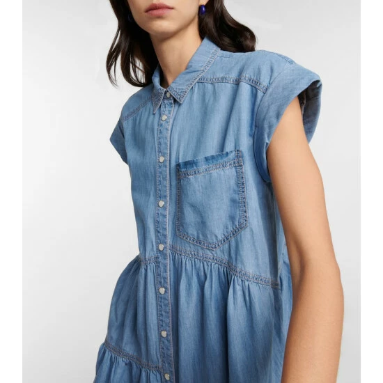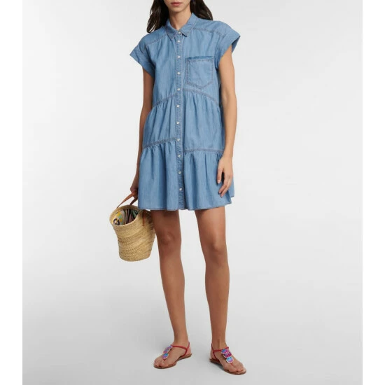 Another contemporary approach to denim from Veronica Beard, the Harrow minidress features asymmetrical tiers for a breezy, loose-fitting design. It features cap sleeves, pearlescent snap-buttons, a patch pocket, and shirting-style collar.