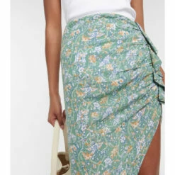 The Hazel midi skirt from Veronica Beard is a versatile warm-weather staple crafted from featherweight fabric printed in delicate florals. It features an asymmetric hemline, flattering ruching, and a soft ruffle adorning the side.