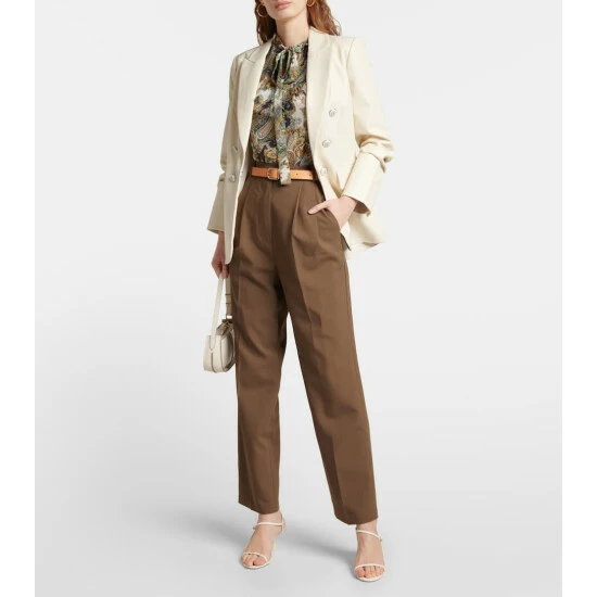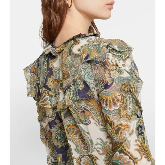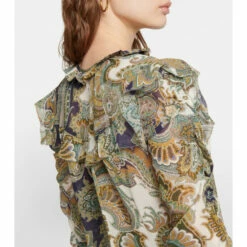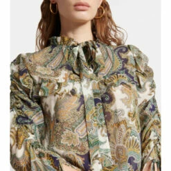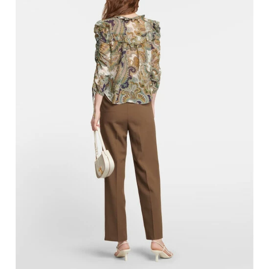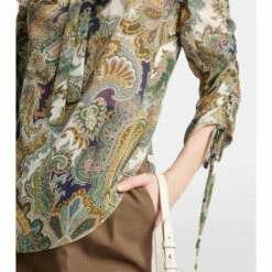 Veronica Beard demonstrates the brand’s love for paisley prints and romantic lines with the Howell blouse. Made from pure silk, this piece features a ruffled yoke, ruched sleeves, and self-ties on the sleeves and neck.