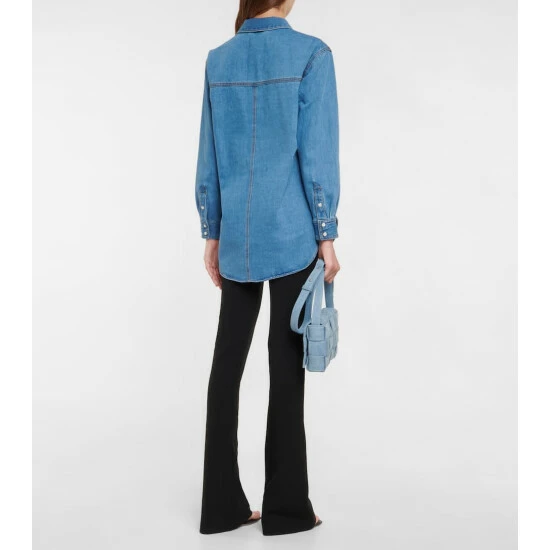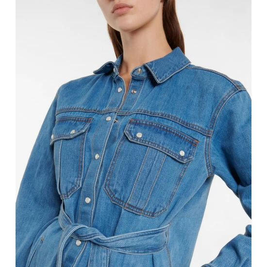 The Mikaela shirt jacket from Veronica Beard is made from medium-wash denim and has classic detailing -including a pointed collar and dual chest pockets. The belted waist balances the dropped shoulders and relaxed silhouette.