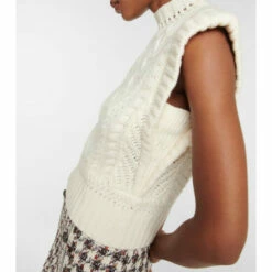 Layer your cold-weather looks with the Pinkett vest from Veronica Beard. The chunky cable-knit style is made from a cozy wool and cashmere-blend and it’s defined by exaggerated shoulders.