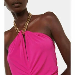 Made from lightweight stretchy fabric in a hot pink hue, this dress from Veronica Beard features ruching on the front and a gleaming gold-toned chain halterneck.