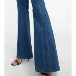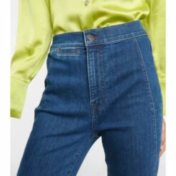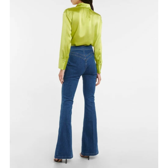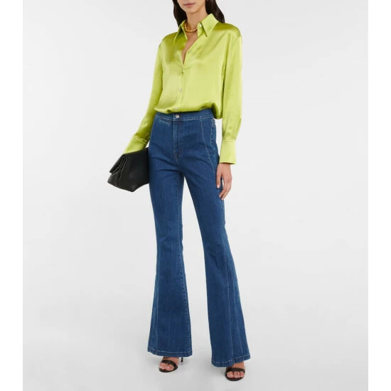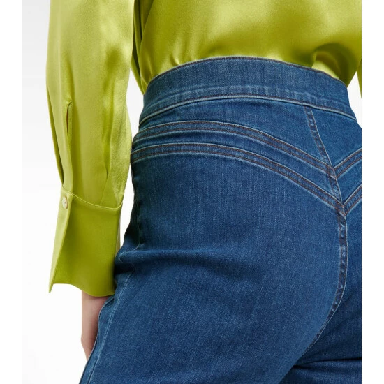 Veronica Beard proves that the most flattering jeans are flared with the Sheridan style. Made from mid-blue wash denim, they have an ultra-high rise and slim legs that flare out below the knee with a fluted look.